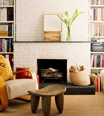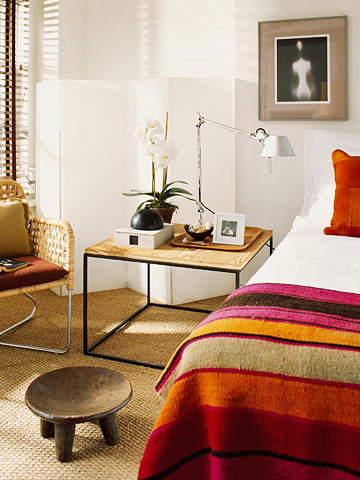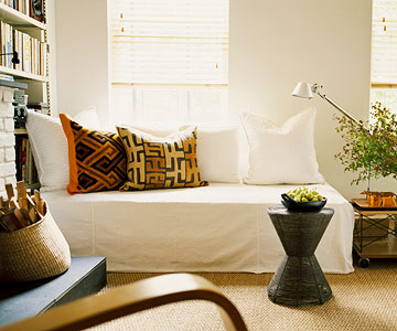Sofa nơi phòng khách trong bức ảnh sau thật ra là chiếc giường đôi được phủ vải trắng xuống tận sàn nhà. Bình thường, nó là chỗ ngồi để tiếp khách nhưng khi cần nó có thể trở thành giường ngủ trưa hoặc giường ngủ cho khách đến thăm nhà. Bổ sung thêm gối tựa to để tạo chỗ dựa lưng của sofa.