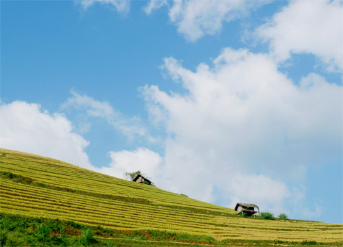 Bầu trời xanh trên thảm lúa vàng và những ngôi nhà bé nhỏ ở Mù Cang Chải.