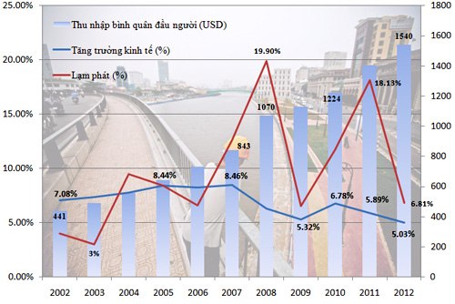 So sánh kết quả thực hiện một số chỉ tiêu quan trọng năm 2012 với thống kê 10 năm qua cho thấy tình hình kinh tế có chiều hướng "ngày một xấu đi": Lạm phát dù giảm nhưng vẫn đang trong chu kỳ biến động mạnh. Tăng trưởng kinh tế rơi xuống mức thấp nhất trong vòng nhiều năm qua trong khi tốc độ tăng thu nhập bình quân đầu người có phần chững lại. (Số liệu: GSO, WB)